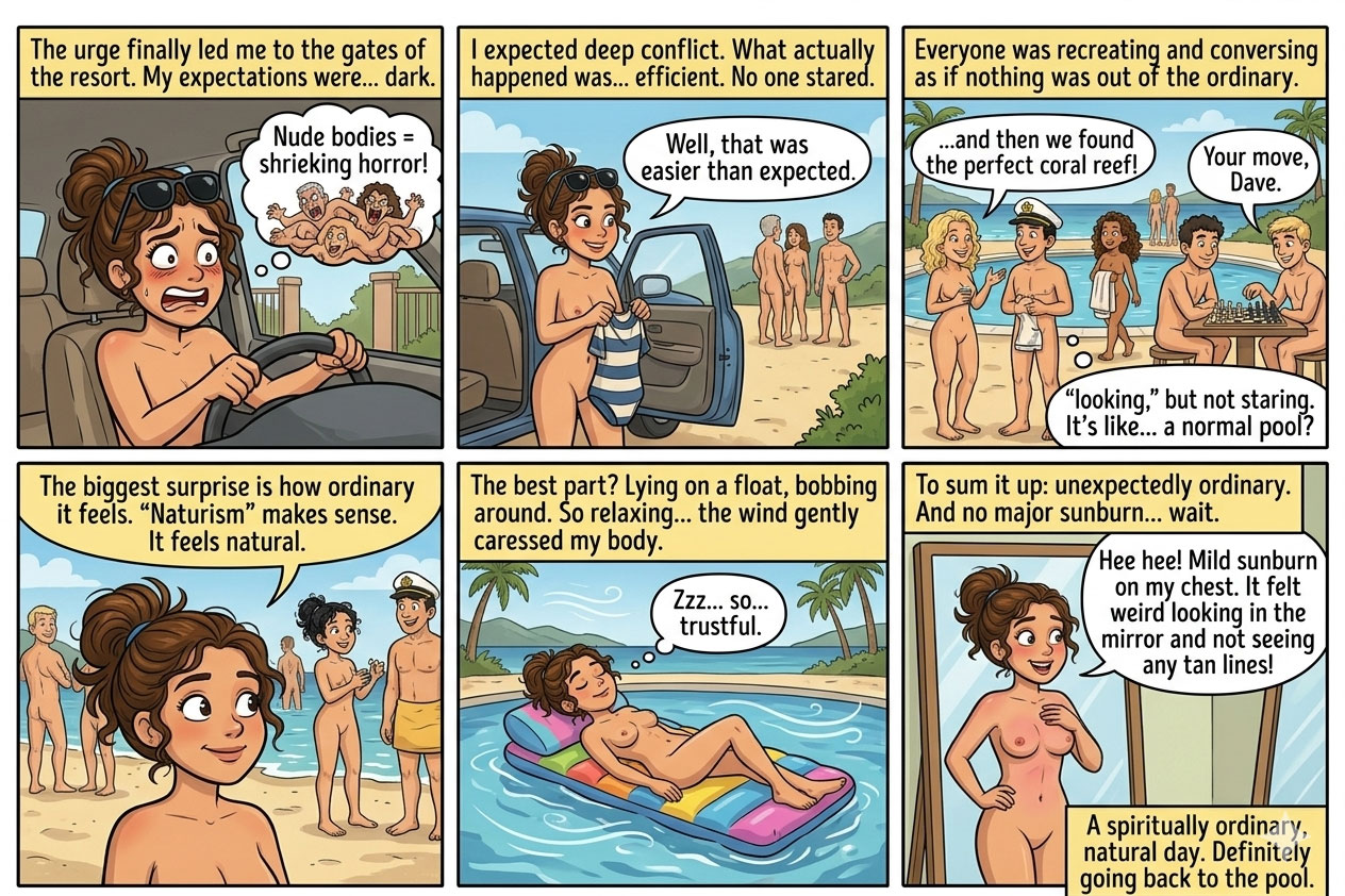Well, today, I finally went with the urge to go to a nudist resort. As events proved, what I expected to happen was very different from what actually happened.Prior to today, I have only seen the female body once, ever, and even that was but a brief glance. So I fully expected to shriek in horror at the sight of nude bodies, especially nude women. Next, I thought, I was going to be deeply torn between keeping my clothes on as a last line of defense and taking them off. Then I would disrobe, and a wonderful spirit of peace and freedom would descend on me. The day would proceed to become a spiritually uplifting, life-changing day.